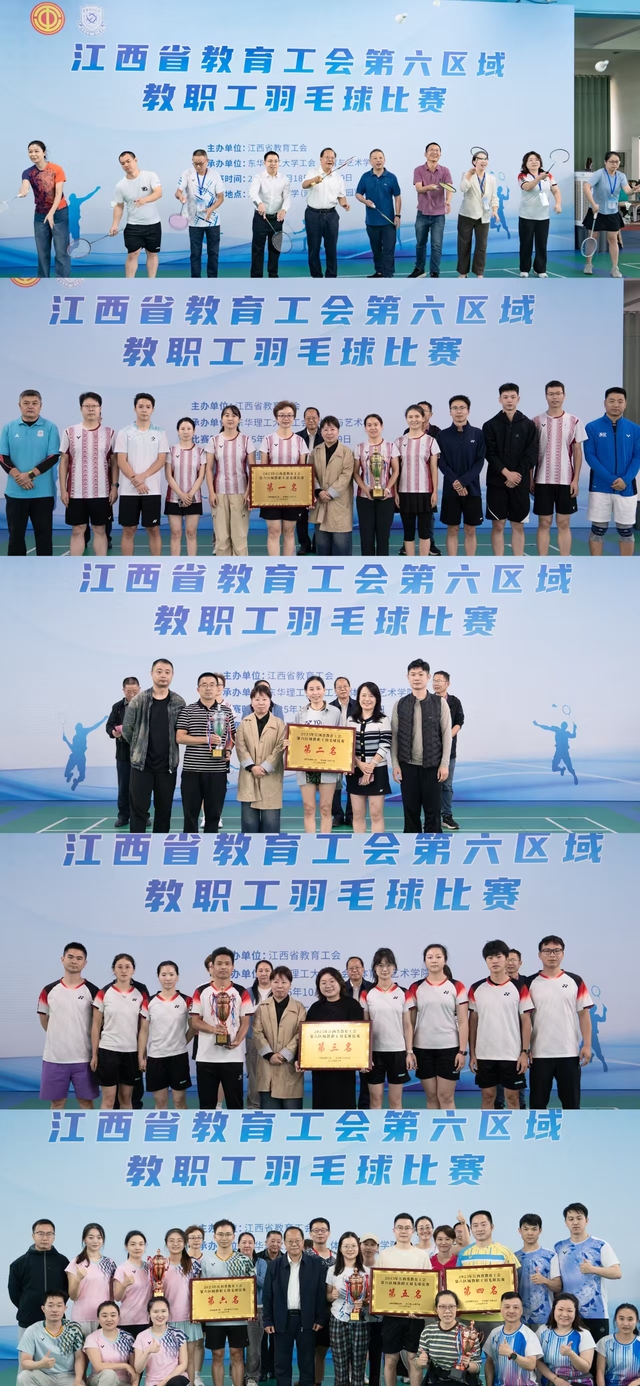 经过27场小组循环赛、交叉淘汰赛的激烈比拼,最终东华理工大学代表队获得团体冠军、九江市教育工会代表队获得亚军、南昌理工学院代表队获得季军,江西艺术职业学院、江西理工大学南昌校区、江西师范大学科学技术学院代表队分列团体第四至六名,南昌师范学院附属中学获得体育道德风尚奖。选手们每一个精准的发球、每一次有力的扣杀、每一场敏捷的救球,都是心理与智慧的较量。他们以球会友,用汗水诠释着对羽毛球运动的热爱,展现出了高超的竞技水平和顽强的拼搏精神。