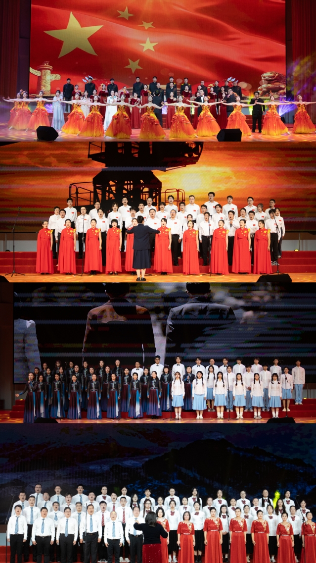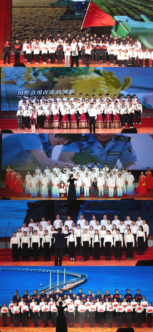 《我和我的祖国》《歌唱祖国》《我的中国心》《我的祖国》《爱我中华》等歌曲集中展现了中华儿女对祖国的深厚热爱、民族自豪感以及薪火相传的家国情怀与责任担当;《明天会更好》《我们走在大路上》《国家》《师者丹心育桃李》等经典曲目,带领观众穿越时光,重温过去的岁月;《铭记》《山河》《追寻》等用合唱与朗诵饱含深情的语言,讴歌了奋斗路上的光辉历程与不变初心。《珊瑚颂》《让中国更美丽》《保卫黄河》《走向复兴》《向往》等以载歌载舞的形式,深情礼赞光辉岁月,热切向往美好未来,实现了过去与未来的深情交汇。